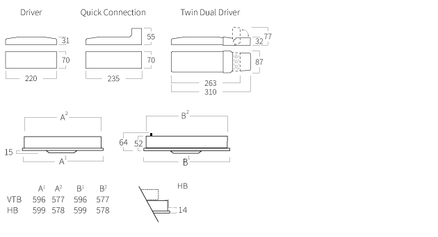 HB – til nedhængte lofter med skjult bæreprofil, kun symmetrisk fastgørelse af loftsplade (tykkelse 20–22 mm). Ved faste lofter kompletteres med ophængningsbeslag, se tilbehør.