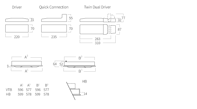 HB – für abgehängte Decke mit verdeckten T-Stangen, symmetrische Befestigung von Deckenplatten (20–22 mm dick). Ergänzung mit Befestigungswinkeln für feststehende abgehängte Decke siehe Zubehör.