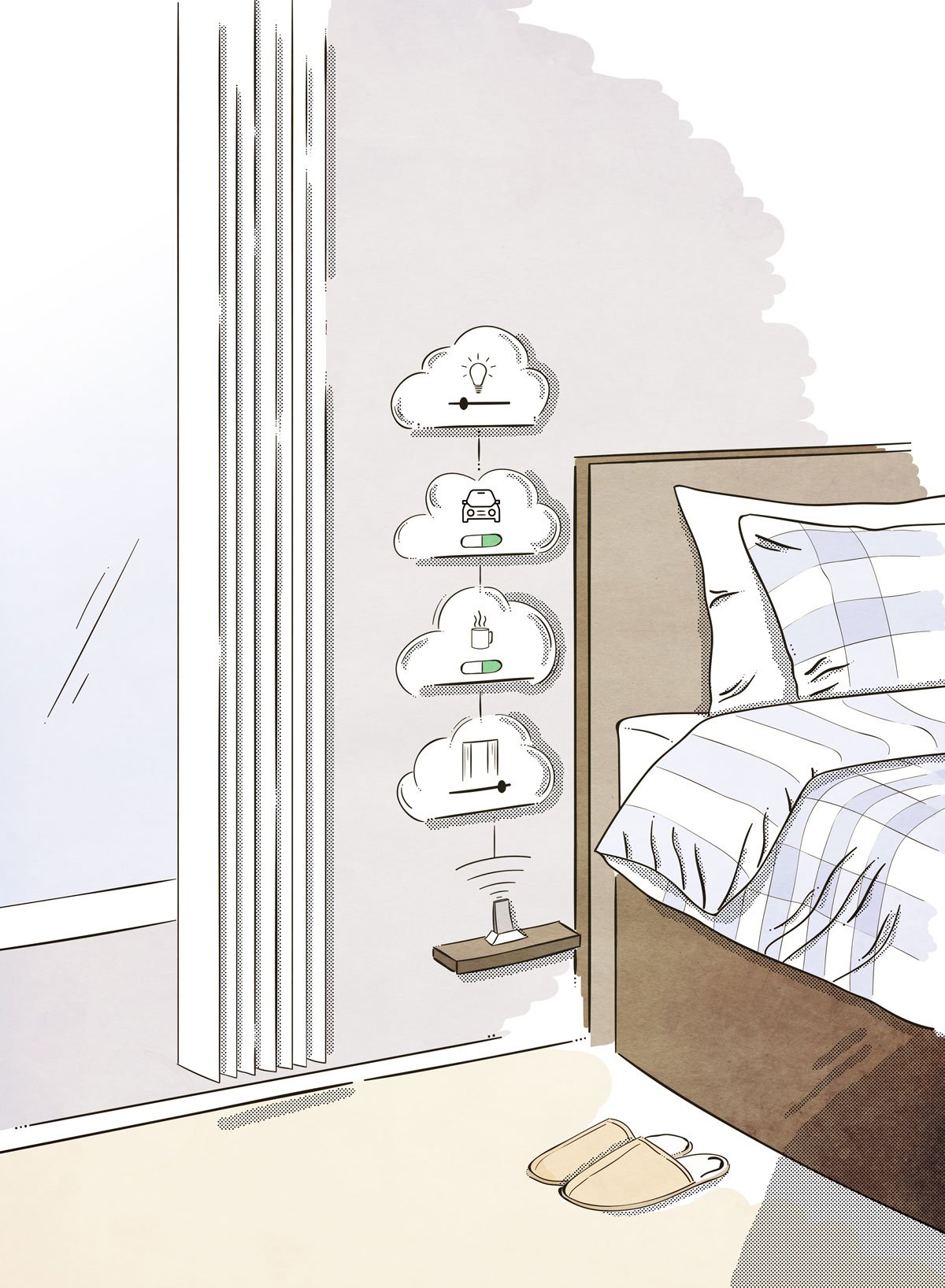 "The alarm clock wakes you up but the blinds, notified by your phone, are already open allowing for the sunlight to enter your bedroom. During the winter, your "wake up light" (intensity and Tunable White) has been turned on for some time before the alarm rings, to prepare your body for getting up. Connected to your sleep patterns, the coffee machine is prepared and the kitchen smells of lovely coffee. When brushing your teeth after breakfast, your toothbrush measures your cortisol and melatonin levels, inputting the data into the lighting installation you will meet for the rest of the day."