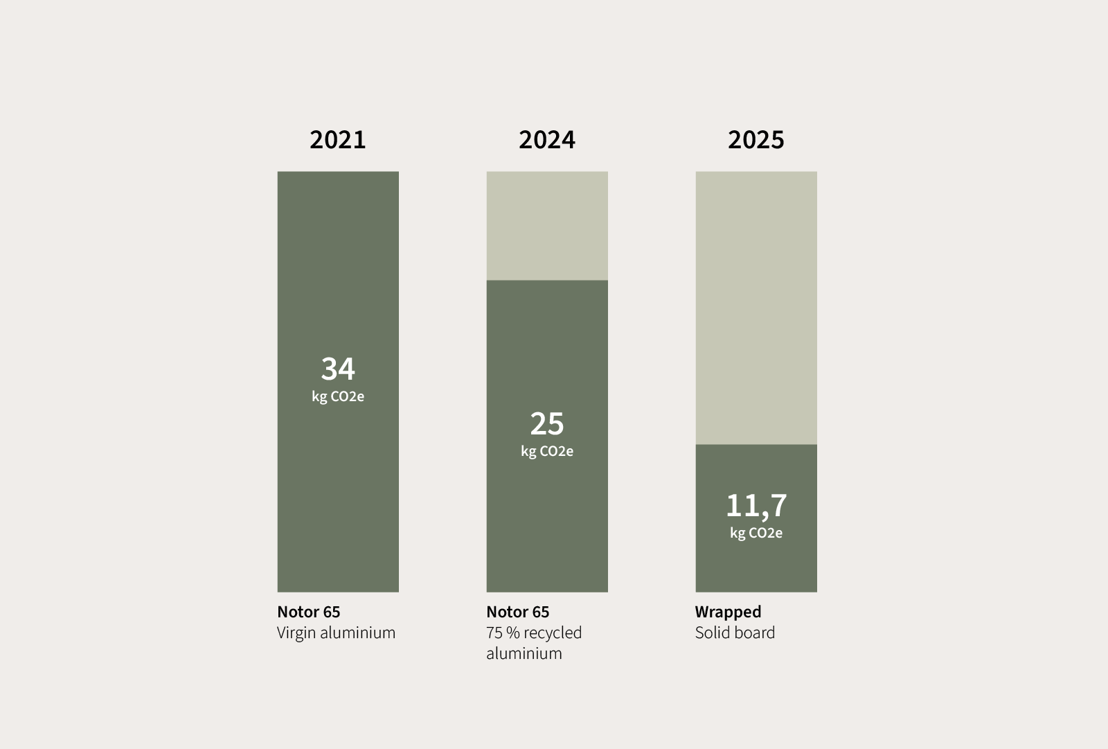 - In 2021 had Notor 65, gemaakt van nieuw aluminium, een klimaatimpact van 34 kg CO₂e.
