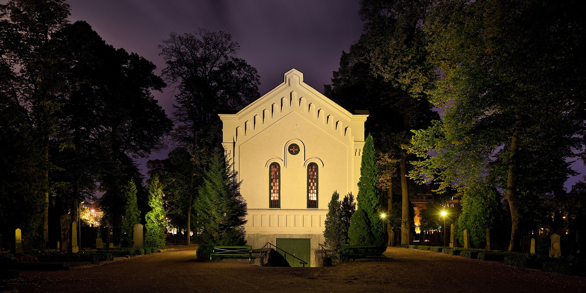 Uppsala was named cemetery administration of the year in 2013, the same year that ‘Comforting lyricism’ was installed. The award was received by Tord Engström, head of Uppsala cemetery, and the justification given was the sustainability work that the cemetery had been actively involved in. The impression is reinforced and the sense of security is increased by the illumination of the interior of Gamla Kapellet.